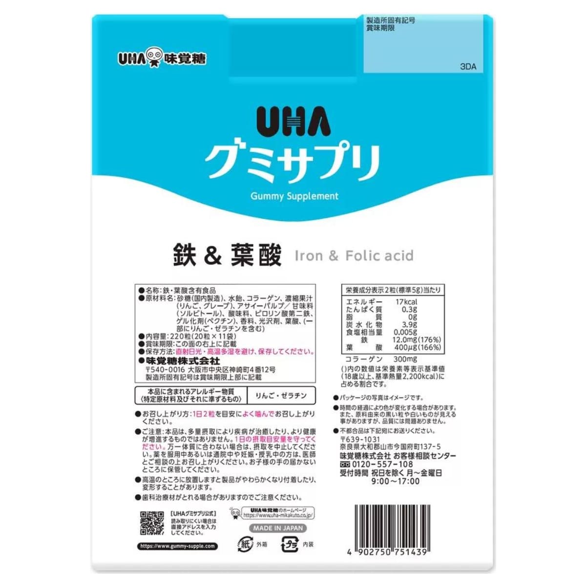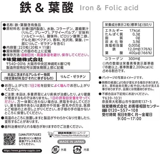 ・原材料名: 砂糖(国内製造)、水飴、コラーゲン、濃縮果汁 (りんご、グレープ)、アサイーパルプ/甘味料 (ソルビトール)、酸味料、ピロリン酸第二鉄、ゲル化剤(ペクチン)、香料、光沢剤、葉酸、(一部にりんご・ゼラチンを含む)