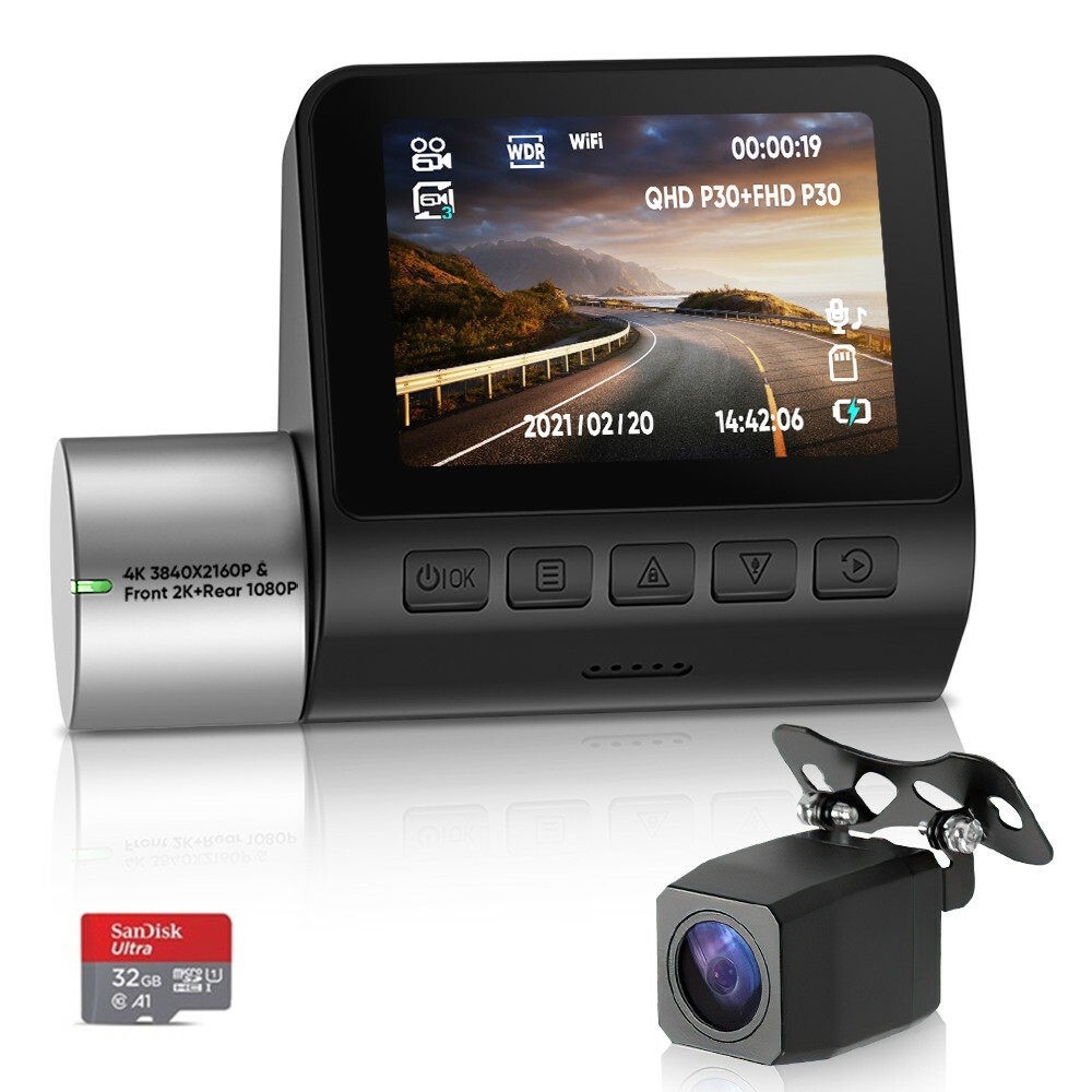 【32GBカード付き】ドライブレコーダー V50 4K 3840×2160Pと解像度:フロント2K+リア1080P 360度回転 前後カメラ 170°広角 WiFi Gセンサー シガープラグと接続コード(対応車:インプット:DC12V-24V/アウトプット:DC:5V-3.1A 長さ:約 335cm)リアカメラコード:約 590cm