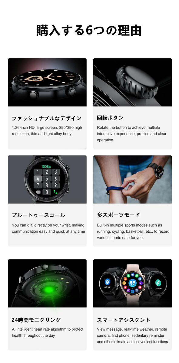 1.36インチHD大画面、390*390の高解像度、薄型軽合金ボディ