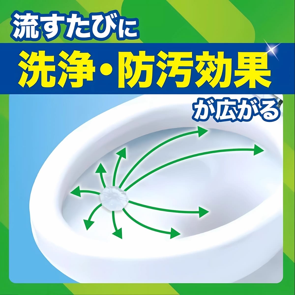 「スクラビングバブルトイレスタンプ」は、便器にスタンプするだけでマラゴニー効果で水たまりからフチ裏まで濃厚ジェルから成分が溶け出し、届きにくいフチの裏から全体的にいき渡ります。水を流すたびに、便器全体を抗菌してピカピカに。