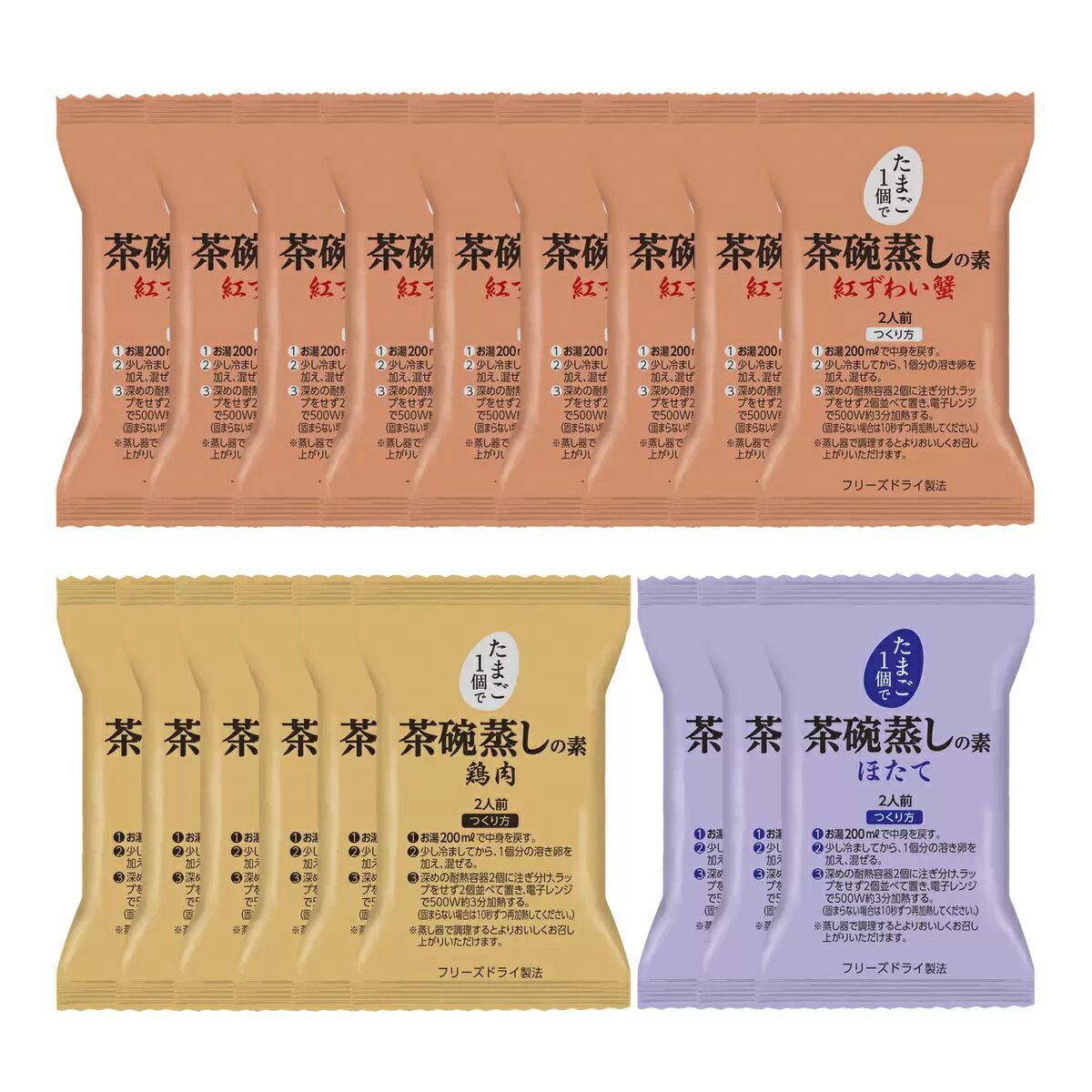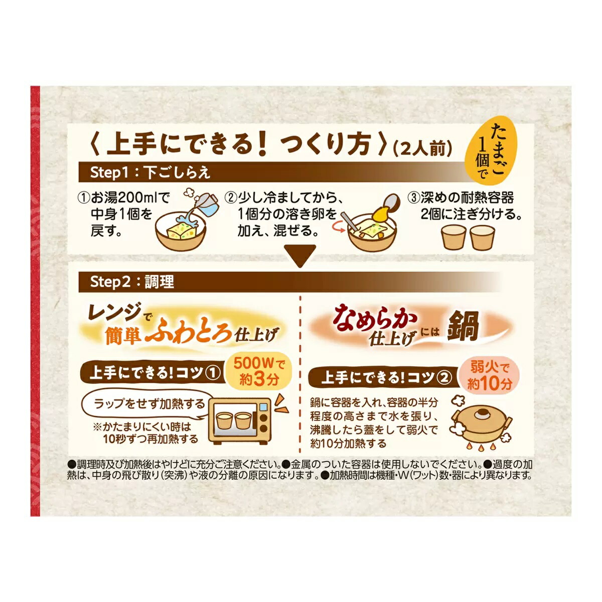 1パックで2人前:卵1個を加えるだけで、簡単に2人前の茶碗蒸しが作れます。