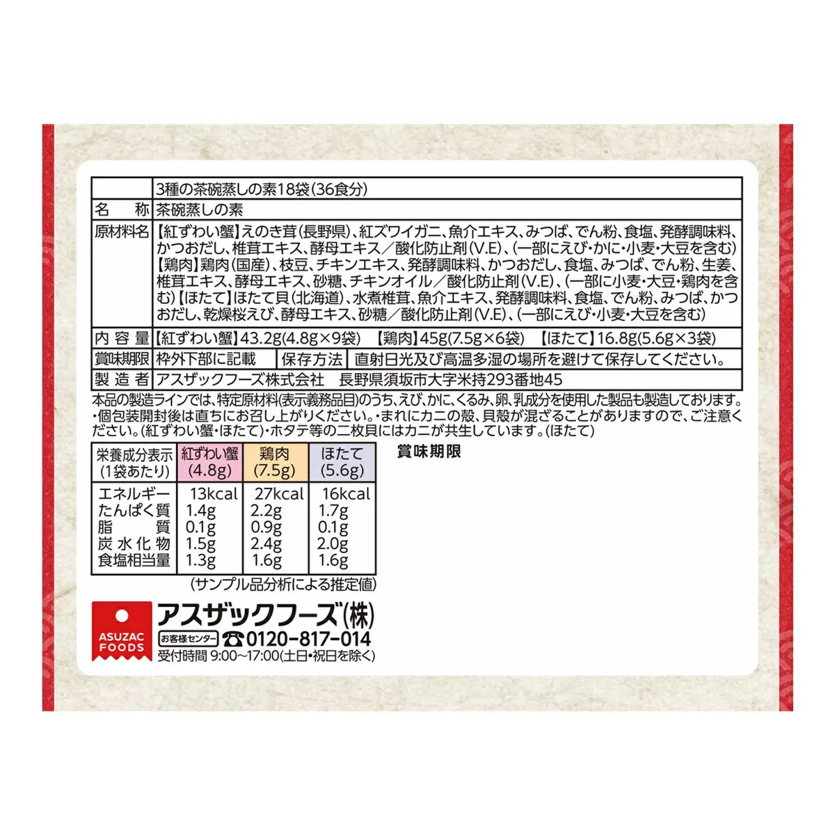 スペック:3種アソート(紅ずわい蟹、鶏肉、ほたて)