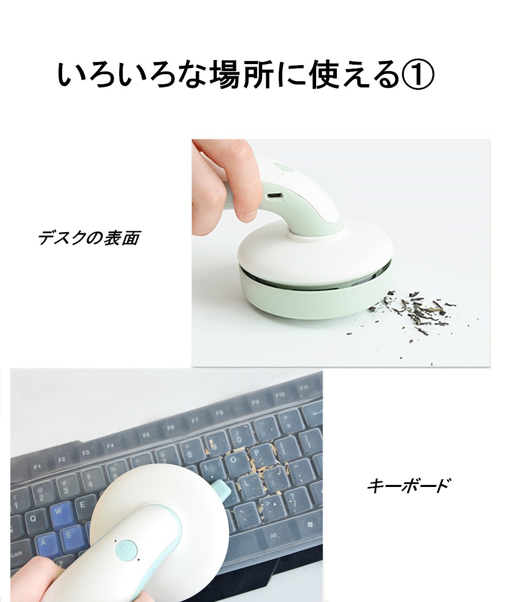 底に螺旋ファンが付き、机の上などの平らな広い場所のゴミをきれいに吸い取ることができます。隙間ノズル付き、家具の隙間や窓の桟など狭い場所もお掃除できます。