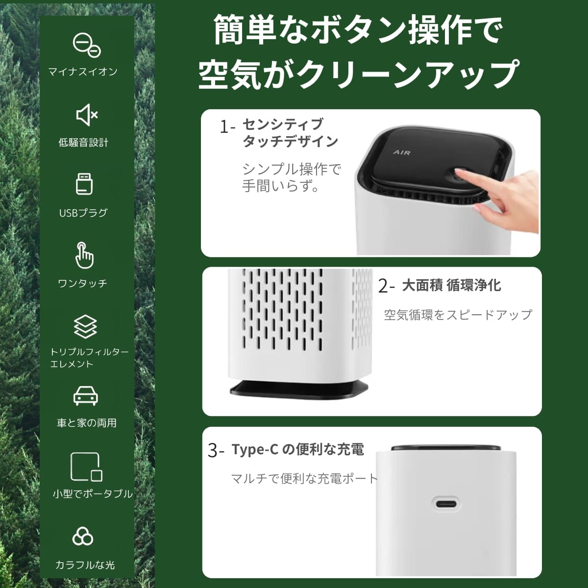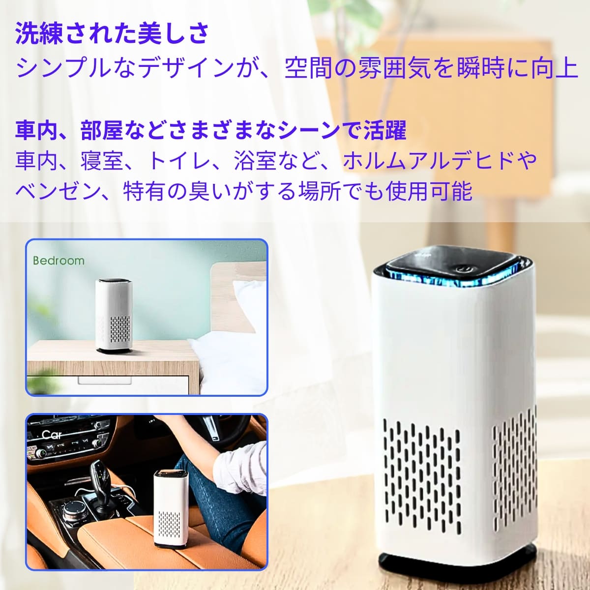さらに、マイナスイオン技術が空気中の有害物質を積極的にキャッチし、浮遊している細菌やウイルスを瞬時に除去。これで、車内や寝室、トイレなどの小さな空間をいつでも新鮮で快適に保てます。