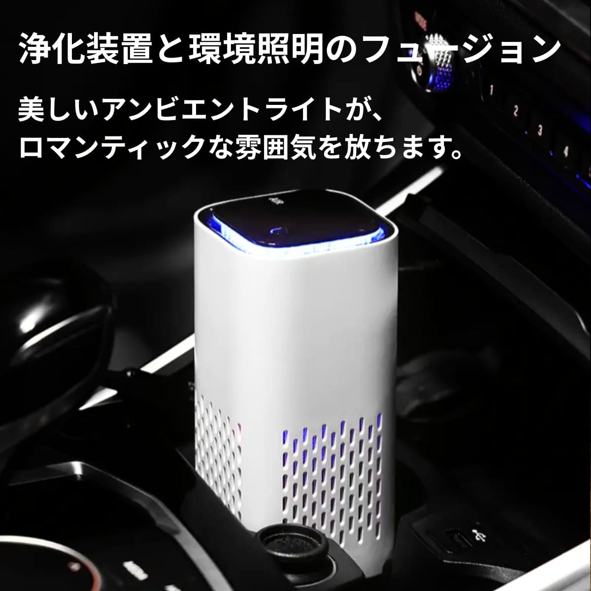 「車内の空気、きれいにしたい」「寝室やトイレ、玄関などのニオイが気になる」そんなお悩みを解決するポータブル空気清浄機。コンパクトながら高濃度800万個のマイナスイオンを発生させ、車内や小空間(<5m³以内)のホコリや臭いをしっかり除去して素早くリフレッシュすることが可能です。寝室・玄関・トイレ・デスク周りなど狭いスペースに最適です。また、タバコ臭、ペット臭、生活臭、ホコリなどを軽減し、快適な空間を実現します。ナイトライト搭載で車内 空間をおしゃれに演出します。