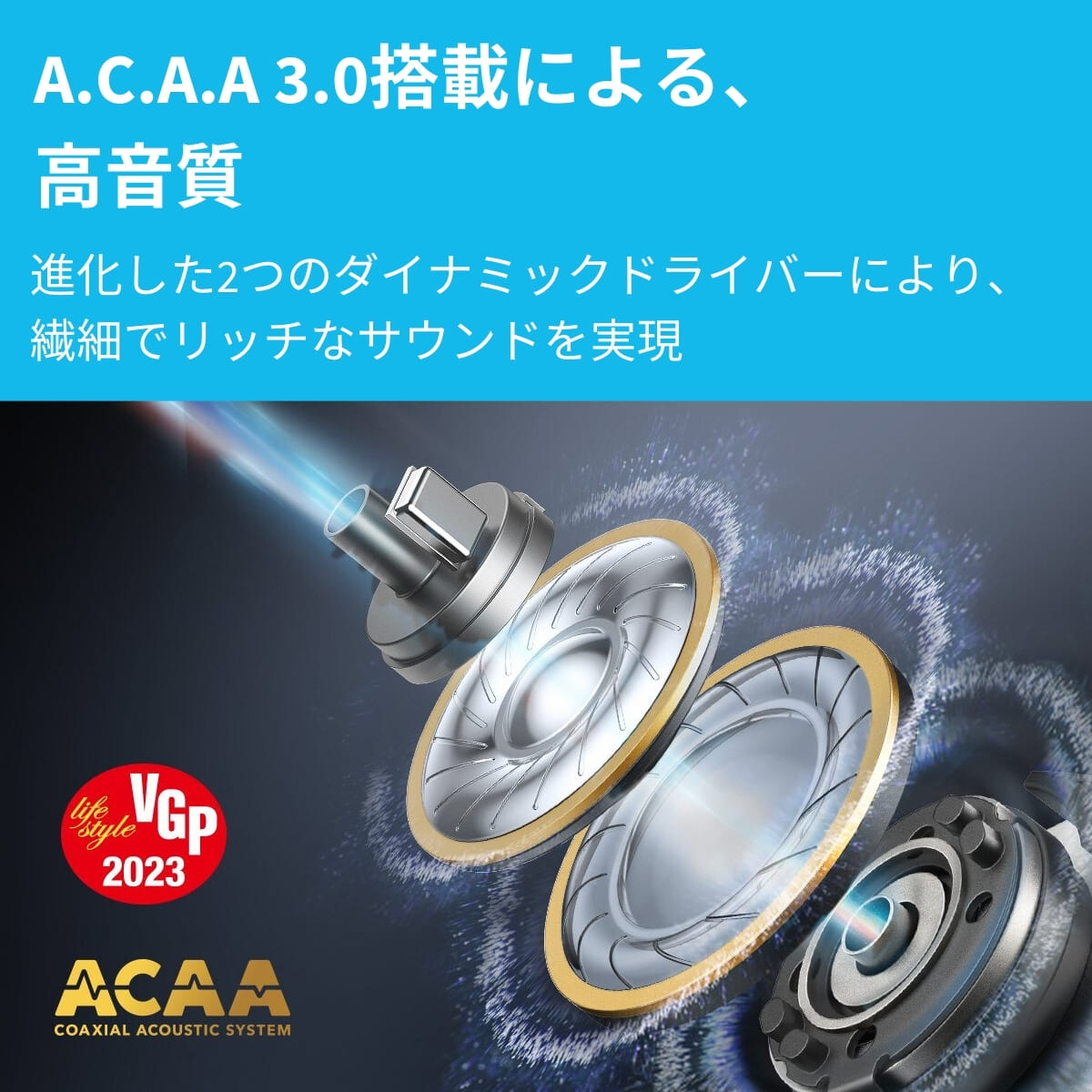 A.C.A.A 3.0 は、オーディオ機器の通信技術の進化版で、音質向上や接続の安定性を改善し、よりクリアで高品質な音楽体験や通話を提供する技術です。Anker独自ドライバー「A.C.A.A 3.0」を搭載し、2つのダイナミックドライバーにより、細かなサウンドも明瞭に聞こえる繊細でリッチな音質を実現します。