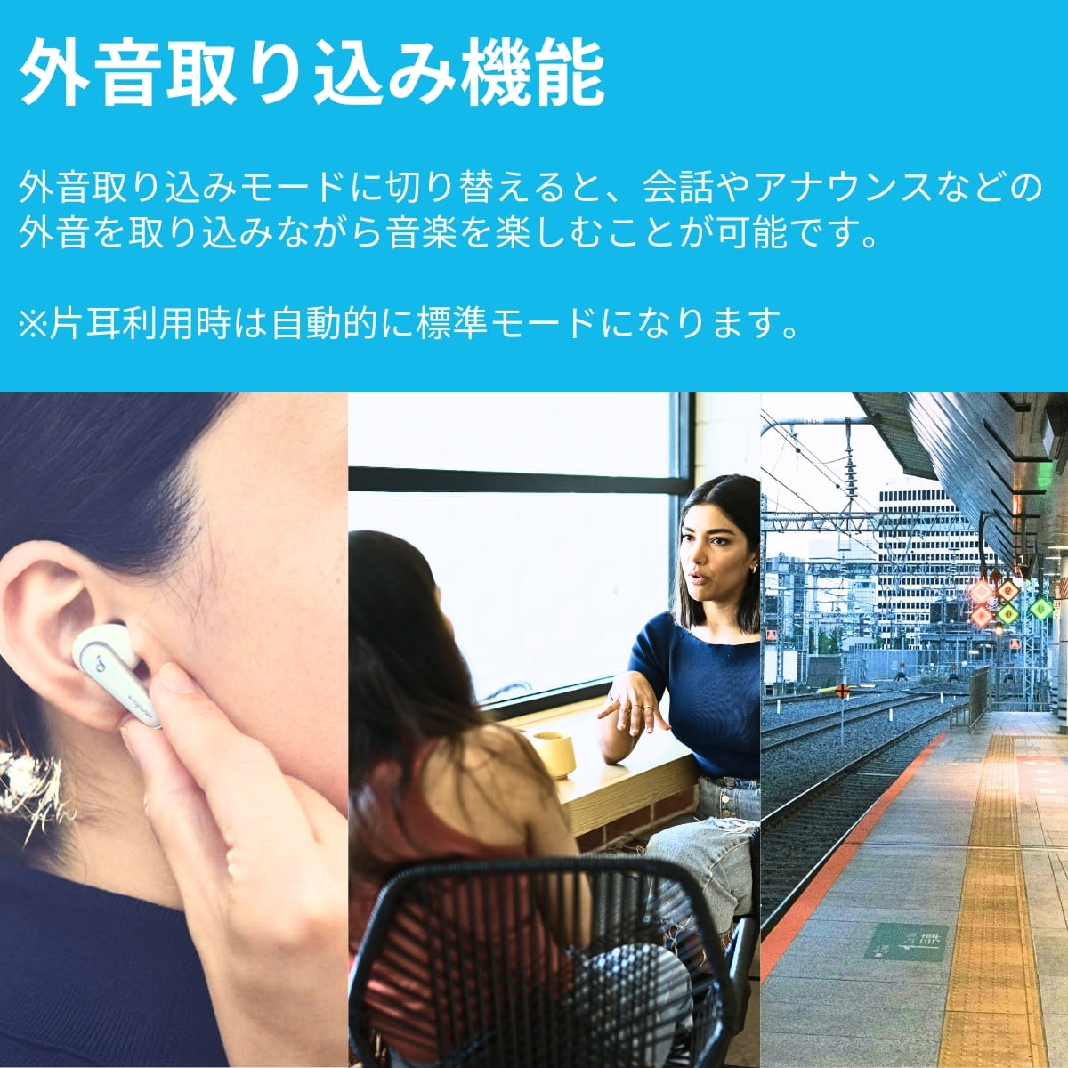 ウルトラノイズキャンセリング 2.0は、Soundcore(アンカー)が提供するノイズキャンセリング技術の進化版です。この技術は、周囲の騒音を強力に遮断し、より静かな音楽体験を提供します。従来のノイズキャンセリング技術よりも効果的に外部の音を打ち消すことができ、特に電車やバス、飛行機などの騒がしい環境での使用に最適で、特に音楽や映画鑑賞時の没入感を高める効果があります。