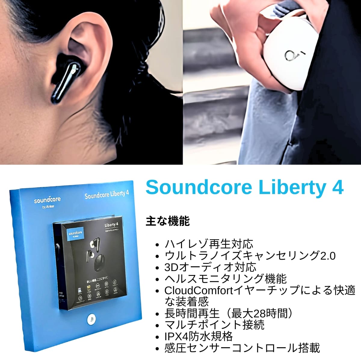 Soundcore Liberty 4は、最新の技術と高音質なサウンドを提供する完全ワイヤレスイヤホンです。A.C.A.A 3.0技術により、繊細でリッチな音質を実現。ウルトラノイズキャンセリングや3Dオーディオで音楽や映画をより臨場感あふれる体験に変えます。